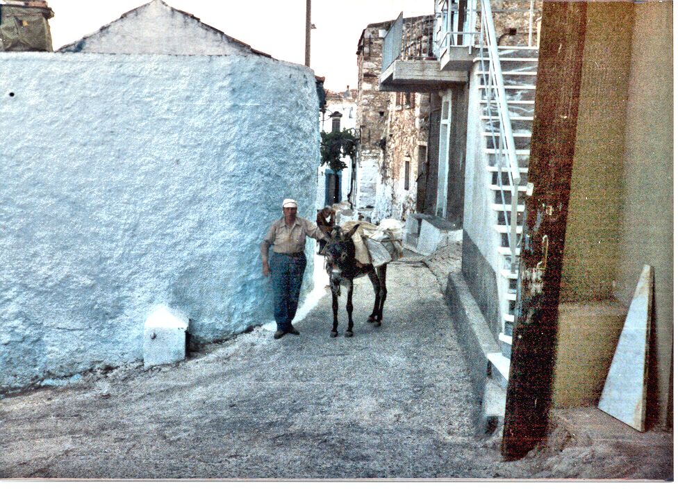 Ένας δρόμος του χωριού κι ένας κάτοικος με το γαϊδουράκι του. Αριστερά η παλιά βρύση "Κάτω σωλήνα" που δε λειτουργεί πλέον...