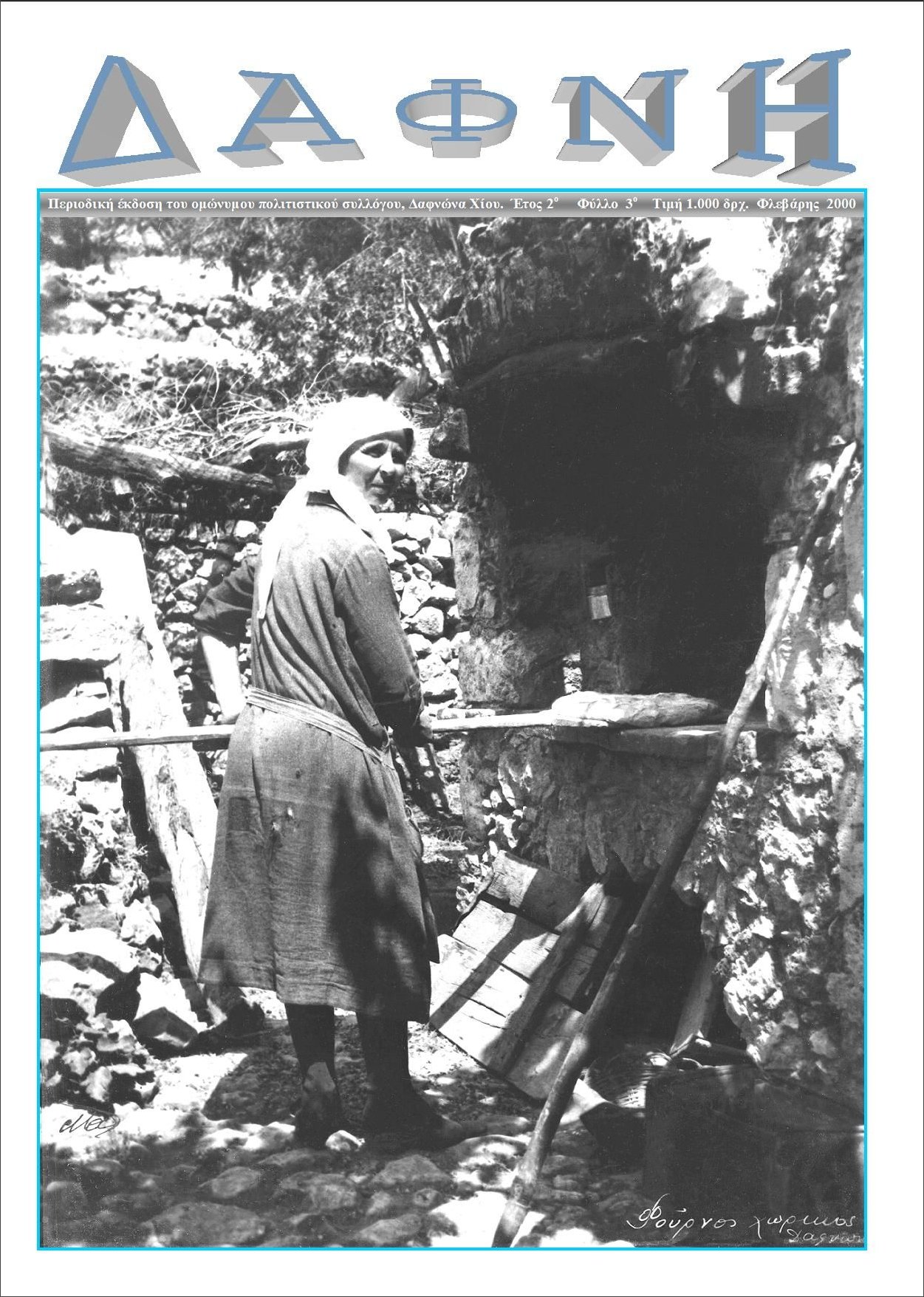 Στο εξώφυλλο, η γιαγιά- Αντωνιά στον φούρνο και στο οπισθόφυλλο ο μπάρμπα-Αντώνης. Ακολουθούν τα περιεχόμενα: Γιατί Βαγγέλη Ρουφάκη, Χρόνια Πολλά, Εγώ, οι κουδουνάτοι κι η...γριά Βαγγέλη Ρουφάκη, Επίγνωση Κώστα Αμπανούδη, Αγαπώντας Κώστα Αμπανούδη, Η Υπαπαντή του Σωτήρος Παπά Παντελ. Καλεώδη, Μπουρλής - Τζανής Πέτρου Μαρτάκη, Το γιόμα ξαποστάσαμε Κώστα Αμπανούδη, Ο Ναός της Υπαπαντής στο Στρατηγάτο της Χίου Μανόλη Μ. Βουρνού, Στο Στρατηγάτο του 20ου αιώνα Βαγγέλη Ρουφάκη, Μαξ Ρεντιάνης. Ο φωτογράφος μας Βαγγέλη Ρουφάκη, Στο λιμάνι της Χίου περιμένοντας το καράβι Φωτογραφία Μαξ Ρεντιάνη, Τα λουκάνικα του Κυριάκου Ηλία Τζανετή, Δαφνούσικο γλέντι Μανόλης Ν. Χαβιάρας, Από το έργο του συλλόγου. Πως εκδίδεται το περιοδικό, Γράμματα από τους αναγνώστες μας, Το αρχείο μου (Ημερολόγιο) Δημητρίου Μέλη, Φώτης Αγγουλές... συνέχεια Βαγγέλη Ρουφάκη, Γεώργιος Σουρής Βαγγέλη Ρουφάκη, Η κακή σύζυγος Κωνσταντίνου Κανελλάκη, Πάλι πρώτη η ΔΑΦΝΗ Σταύρου Ντίλη, Γνωρίζετε ότι..., Στροφή Δημήτρη Βάρου, Περιεχόμενα, Αρχιπέλαγος Μέγα Γιώργη Διλμπόη