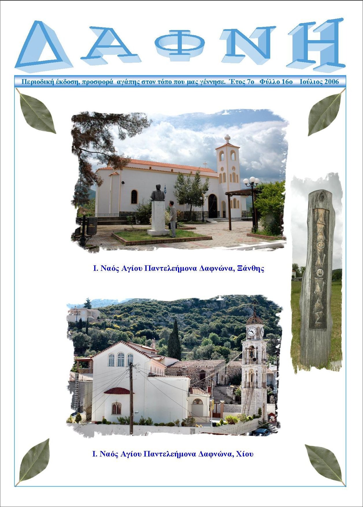 Οι Ι. Ναοί του Αγίου Παντελεήμονα Δαφνώνα Ξάνθης και Δαφνώνα Χίου και βιβλία ανακατεμένα με φυλλάδια, εκδόσεις του εκδοτικού μας οργανισμού, στολίζουν εξώφυλλο και οπισθόφυλλο. Περιεχόμενα: Το πρόστιμο του χρόνου Τζένης Συρρή-Χαννάκη, Εν όψει… Δημοτικών εκλογών Θ. Κοκκαλιάδη-Γ. Μουτάφη, Πολιτική-πολίτευμα-πολιτικός Ιάσωνος Ευαγγέλου, Ταξιδεύοντας... Βαγγέλη Ρουφάκη, Ένας… Δαφνώνας στη Ξάνθη, Δη. Πε. Θε. Κομοτηνής και… άλλα Βαγγέλη Ρουφάκη, Χιώτικα Αφηγήματα Πέτρου Ι. Μαρτάκη, Του αδελφού - Ζωή Ειρήνης Νικολάκη-Καλαμάρη, Απόκριες στην πανέμορφη Ρόδο Βαγγέλη Ρουφάκη, Καλοκαιριάτικες ασχολίες-εκδηλώσεις κ.λ.π. Βαγγέλη Ρουφάκη, Η Ελληνική γλώσσα στην Κύπρο Ανδρέα Ι. Βοσκού, Τέσσερα Παλληκαρκα Κυπριακό Δημοτικό τραγούδι, Το Χαλίτικον χωράφιν Παύλου Λιασίδη, Θρησκευτικά κειμήλια Σεβαστής Χαβιάρα-Καραχάλιου, Δαφνώνας Χίου - Δαφνώνας Ξάνθης Φωτογραφίες, Οδοιπορικό στην Αγιά Μαρκέλλα, με το φακό του Μαξ Ρεντιάνη Μαξ Ρεντιάνη, Το Δεσποινάκι και η οργιά του διαβόλου Γεωγίου Μ. Φράγκου, Δίψα Χρυσοστόμου Γελαγώτη, Αδαμάντιος Λεμός ο ανυπότακτος εραστής της Τέχνης Ευαγγελίας Παπαζή, Η διπλανή φωτογραφία Βαγγέλη Ρουφάκη, Απεβίωσε ο θεατράνθρωπος Αδαμάντιος Λεμός http://culture.ana-mpa.gr, Μια θλιβερή επέτειος Βαγγέλη Ρουφάκη, Οδηπορικό Μνήμης Καλοκαιριού Κώστα Αμπανούδη, Θεριστής φεγγαριού Τέχνης Αδόκιμος, Έκανα λάθος Τζένης Συρρή-Χαννάκη, Η μπαλάντα των μοιραίων Χρυσοστόμου Γελαγώτη, Το Αρχείο μου Βαγγέλη Ρουφάκη, Γράμματα από τους αναγνώστες μας, 1952 Η Αλεξάνδρα με το μοσχαράκι Μαξ Ρεντιάνη, Εποχή-αιώνας Ιάσωνος Ευαγγέλου, Περιεχόμενα, Του παπά-Στρατή η κόρη Φάνη Φαντέμη