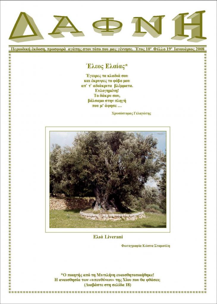 Η ελιά LIverani με το ποίημα του Χ. Γελαγώτη στο εξώφυλλο και κάτοικοι των "Δαφνώνων" Χίου και Ξάνθης στην εκκλησία του Δαφνώνα Χίου στο οπισθόφυλλο. Περιεχόμενα: ~~Του κόσμου οι τρανοί λαοί-Τώρα που άλλαξε ο καιρός Ειρήνη Νικολάκη-Καλαμάρη, Ας έρθει μπόρα Ειρήνη Νικολάκη-Καλαμάρη, Κάτι … σα διακήρυξη Χρυσοστόμου Γελαγώτη, Κάλαντα, παινίματα κι ευχές... Βαγγέλη Ρουφάκη, Σαν παραμύθι Χριστουγεννιάτικο... Μάρω Ματθαίου, Στρατηγική de facto: «Μαθήματα Ελευθερίας» www.lygeros.org /Prosfyges/ contentb3a3.html?id=110, Ο θάνατος του Παλαιολόγου (απόσπασμα από βιβλίο) Α. Βαφειάδου, Ταξίδι στο χρόνο Ευαγγελίας Παπαζή, Ανταπόδοση αγάπης η ανταπόδοση επίσκεψης Βαγγέλη Ρουφάκη, Νέστος-Περιβάλλον Δημοτική Επιχείρηση Νέστος-Ροδόπη, Μαγδαληνή-Η χήρα Δημήτρη Κόκκου, Στη «Δάφνη» Αθανασίου Σταμπούλου Λαϊκού Ποιητή, Εικόνες Ντροπής Αρχείο Βαγγέλη Ρουφάκη, Οι Κατσικάνταροι Γ. Μ. Φράγκου, Ο ποιητής από τη Μυτιλήνη και η ελιά Liverani! Βαγγέλη Ρουφάκη, Μύθος αλληγορικός μιας πραγματικότητας Ιάσονα Ευαγγέλου, Ο γάμος και η απιστία Ιάσονα Ευαγγέλου, Το Αρχείο μου Βαγγέλη Ρουφάκη, Γράμματα από τους αναγνώστες μας, Πετροπόλεμος Χρυσοστόμου Γελαγώτη, Δυο Νέα Μουσεία Κοκκινάκη Δημήτρη, Μαθουσάλες… Από την Εφημερίδα «ΝΕΟΛΟΓΟΣ» Δημήτρη Μελαχροινούδη, Η ιστορία γύρω από μια ελιά Δημήτρη Μελαχροινούδη, Το τελευταίο γεφυράκι Αρχείο Βαγγέλη Ρουφάκη, Κολοσσαίο 12-8-75 Γεώργη Διλμπόη, Περιεχόμενα, Το ιερό σόφισμα της αθανασίας Ιάσονα Ευαγγέλου