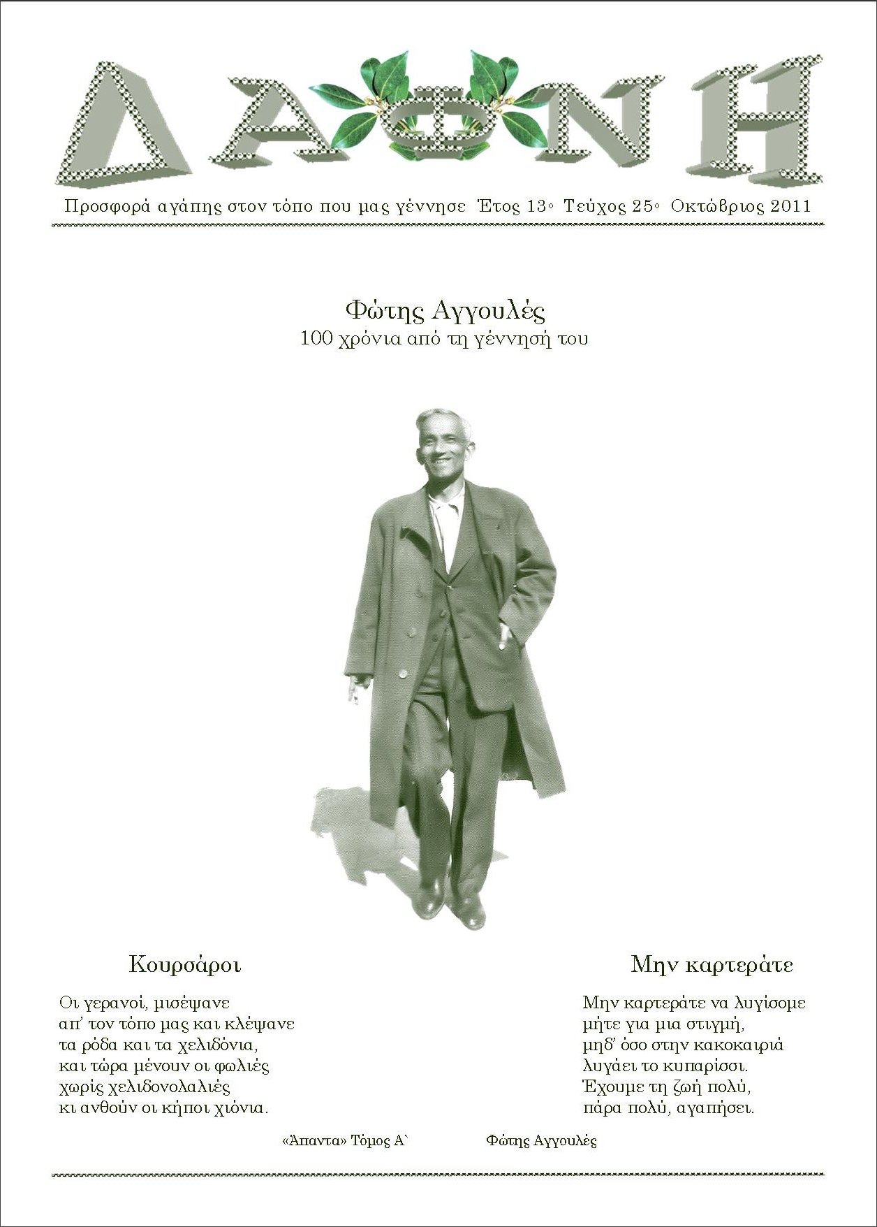 Στο εξώφυλλο αυτού του τεύχους ο Φώτης Αγγουλές και στο οπισθόφυλλο το αντιμίνσιο του Αγίου Μακαρίου. Περιεχόμενα: Κουρσάροι-Μην καρτεράτε Φώτη Αγγουλέ, Διονύση Μπάμπη Σαχτούρη, Η Χιώτισσα Ιάσονα Ευαγγέλου, Η μικρή Ελλήνη Ιάσονα Ευαγγέλου, Φθινόπωρο Βαγγέλη Ρουφάκη, Εξεδήμησεν εις Κύριον ο Χίου Διονύσιος Βαγγέλη Ρουφάκη, Μνήμες από την κατοχή Πολύκαρπου Γερμανού, Πολιτιστικό καλοκαίρι Βαγγέλη Ρουφάκη, Οι σαμποτέρ της… Δόξας Χαριλάου Α. Ιατρίδη, Γράμμα του Κώστα Περρίκου στο γιο του Κώστα Περρίκου, Φώτης Αγγουλές Το πέρασμά του απ’ τη ζωή Γεώργη Διλμπόη, Φώτης Αγγουλές, Μετά την κηδεία, Στα Σαράντα του Κώστα Χαλλιορή, Για τον ποιητή Φώτη Αγγουλέ Γιάννη Ρίτσου, «Προορισμός Δαφνώνας» Βαγγέλη Ρουφάκη, Παναγιώτης Νεαμονίτης Βαγγέλη Ρουφάκη, 100 και πλέον χρόνια πριν... Βαγγέλη Ρουφάκη, Μικρή περιήγηση στα γραφικά χωριά της Β.Δ. Χίου Αντώνη Τενέδιου, Γράμματα από τους αναγνώστες μας, Φώτης Αγγουλές, Απόσπασμα βιογραφίας Γεώργη Διλμπόη, Στοχειωμένη νύχτα Φώτη Αγγουλέ, Μείνε ΙΙ Φώτη Αγγουλέ, Για μια γυναίκα κι από ένα κόκαλο Γεωργίου Μιχ. Φράγκου, Τεμάχιον Σημαίας... Κ. Χατζηπατέρα-Μ. Φαφαλιού, Το χωριό του Φώτη Αγγουλέ, Περιεχόμενα, Αγάπη Γεώργη Διλμπόη, Αντιμήνσιο του Αγ. Μακαρίου-Θρησκευτικά Κειμήλια Σεβαστής Χαβιάρα-Καραχάλιου