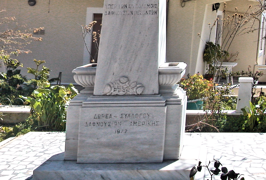 Έργο του Συλλόγου Δαφνουσίων Αμερικής, προς τιμήν των πεσόντων Δαφνουσίων "πάλαι τε και επ' εσχάτων".